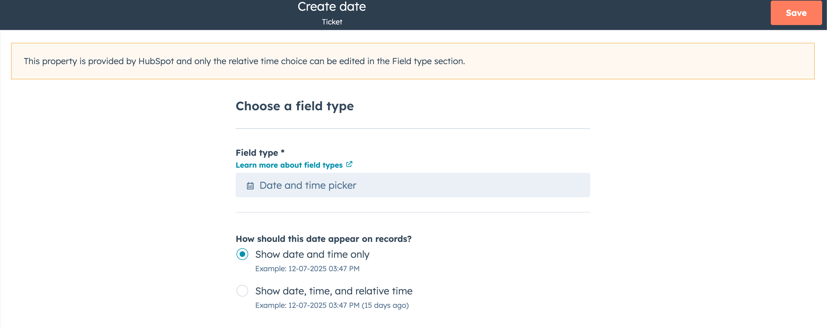- Confirm that the field type is a date or date-time type, and that Show relative time from today is enabled. This controls whether you see “X days ago” vs a fixed calendar date when viewing the property on records: